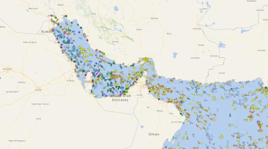 Sites de monitoramento do transporte marítimo mostravam a circulação de dezenas de embarcações pelo estreito na manhã desta quarta-feira (8). A movimentação foi registrada pelo site Vessel Finder (veja acima).